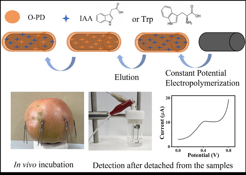 该研究针对传统方法制备分子印迹电化学传感器时,因循环伏安法中较宽的电位范围导致模板易被氧化、致使吸附不稳定的问题,采用恒电位法进行电化学聚合,通过电位的精确控制,避免了聚合过程中IAA等电化学活性模板分子的氧化,使其可完整保存在传感器的分子印迹膜上,这样传感器可以在孵育阶段稳定吸附样品中IAA并在脱离样品溶液后保持高响应信号,确保传感器可用于电活性物质的原位分析。同时为适应原位检测场景,传感器设计为针式结构,可直接插入番茄果实完成原位孵育,无需复杂的样品前处理,对植物组织的损伤最小化。在利用二元线性回归分析的策略解决了生长素前体色氨酸(Trp)对IAA检测的干扰之后,制备的传感器可有效揭示番茄果实从青涩到成熟过程中各部位中IAA含量的下降趋势,与先前的文献报道一致。该研究可为分子印迹电化学检测在原位分析中的进一步扩展应用奠定基础。
