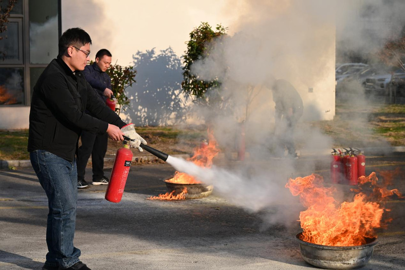 在应急疏散演练环节,学院师生按照徐友飞的现场指令,在保卫处工作人员和学生志愿者的引导下,迅速沿预定路线有序撤离至指定安全区域,整个过程紧张有序、配合顺畅;随后的灭火实操环节,师生认真聆听灭火器使用要领讲解,依次上场进行实操演练,亲身体验“提、拔、握、压”的操作步骤,切实掌握了扑救初起火灾的基本技能。